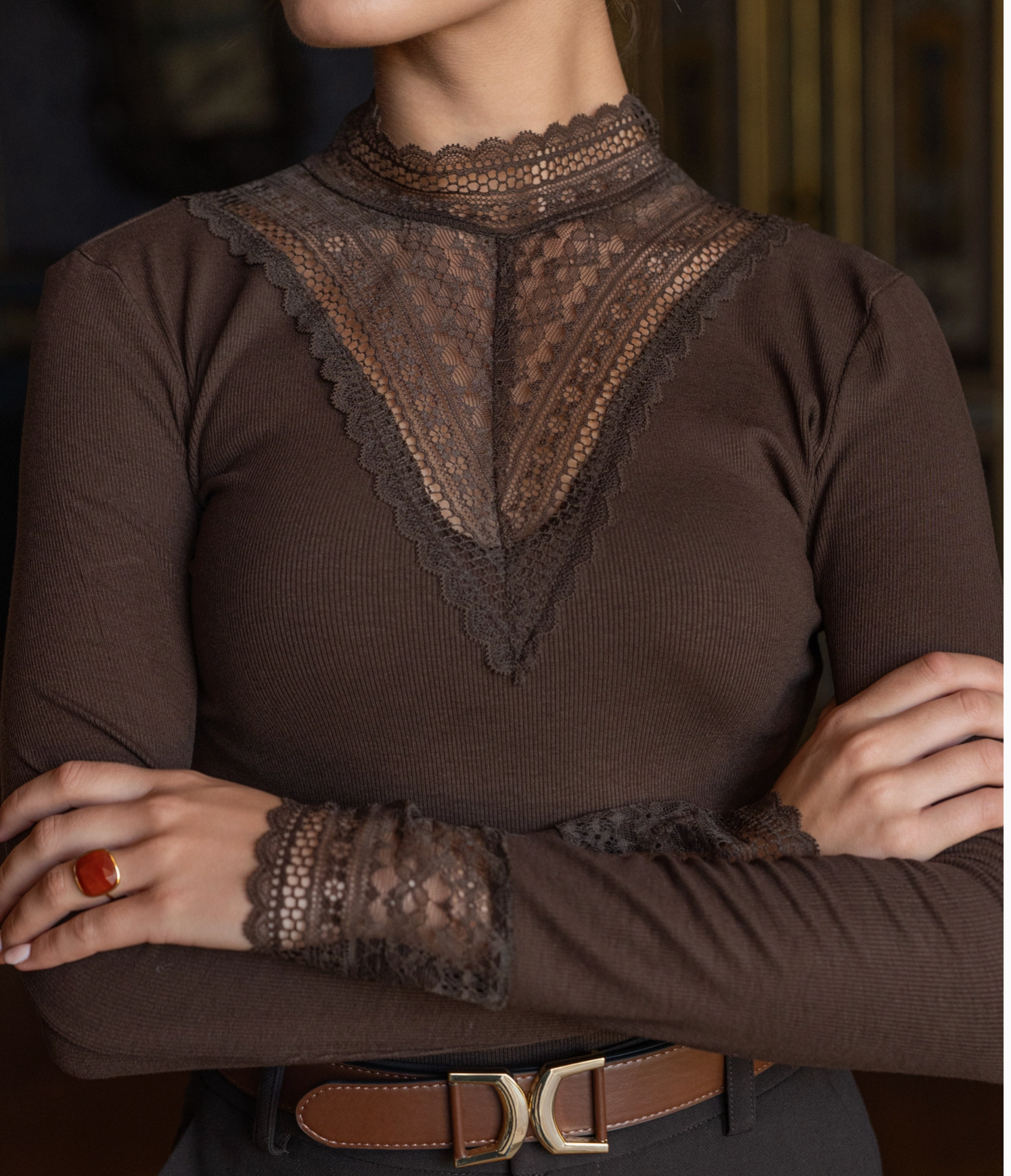 LIMITED PIECES: In chocolate brown, the colour of the season! This top can be worn on its own, or is perfect as a layering piece under a knit or vest. This piece pairs beautifully with the Chocolate Tweed Jacket. The main body of the top is ribbed, with a lace high neck collar which plunges to a V-shape lace insert on the front and back enhanced with openwork trims and delicate scallops. The long sleeve cuffs are adorned in lace, with a finely scalloped finish (beautiful detailing).