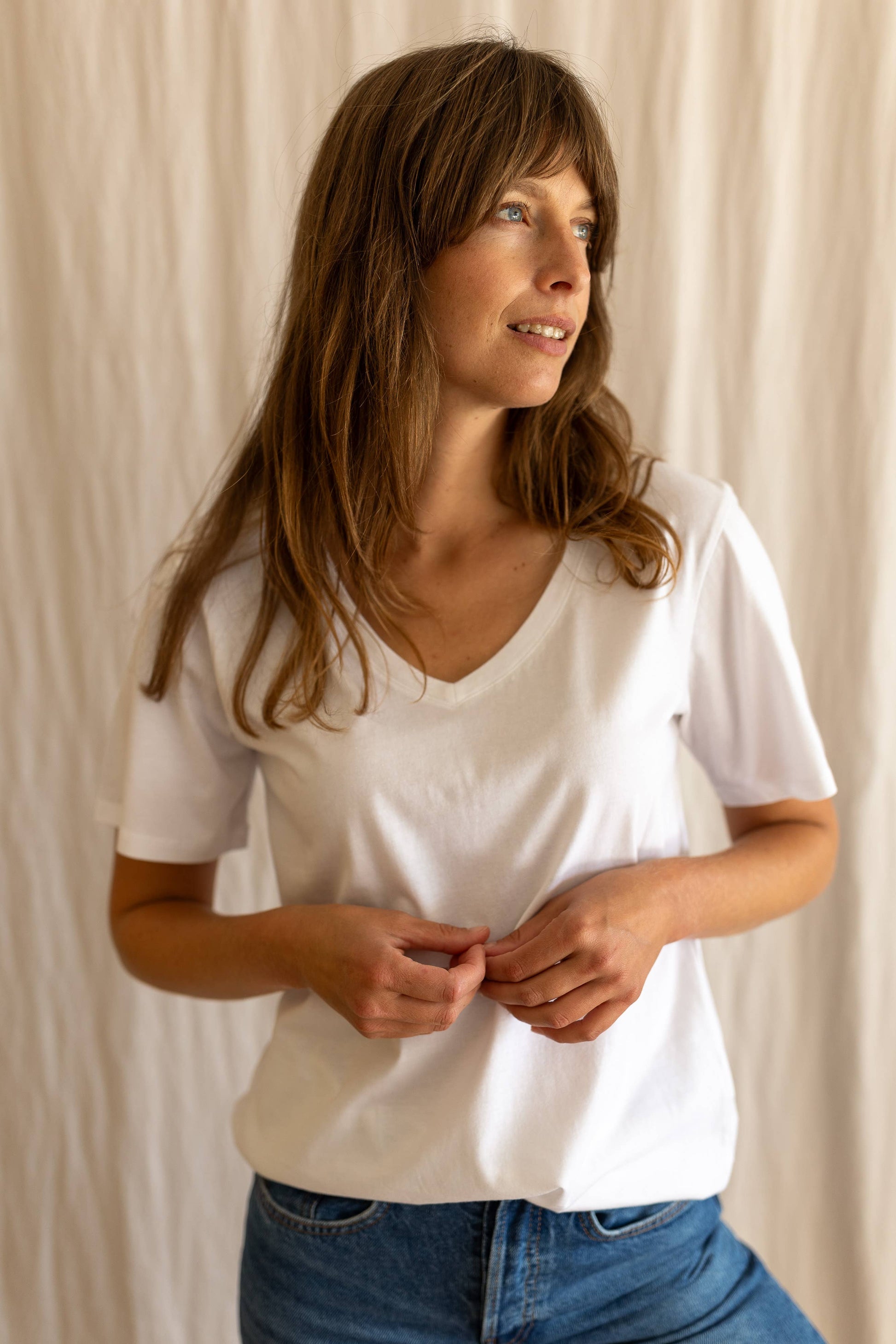 STYLE NOTES: cut in organic cotton jersey, with the most flattering body-skimming fit designed to flatter your shape. Sleeves that offer great coverage whilst also working rolled up for a styled look. Curved hem to the front and back for flattering thigh and bum coverage.